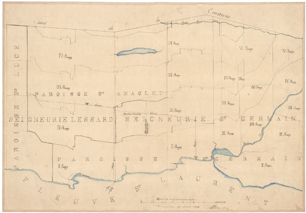 Sur ce plan des paroisses Saint-Anaclet-de-Lesssard et Saint-Germain figurent une partie du fleuve Saint-Laurent, la rivière Rimouski, la rivière du Bois brûlé, les limites des paroisses, les églises, les chemins, le numéro des rangs ainsi que les noms François Couture et Pierre Côté