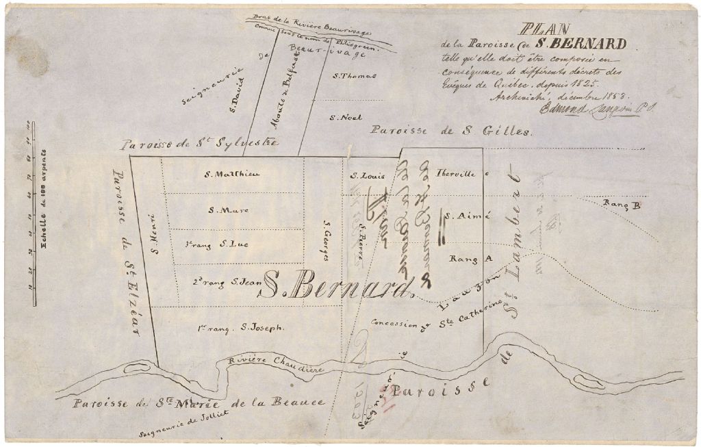 Plan de la paroisse de Saint-Bernard [Dorchester] telle qu'elle doit être composée en conséquence de différents décrets des évêques de Québec depuis 1825.