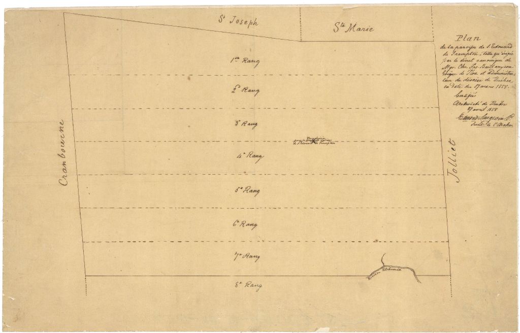 Plan de la paroisse de Saint-Edouard de Frampton telle qu'érigée par le décret canonique de Mgr Charles françois Baillargeon évêque [...] en date du 17 mars 1858