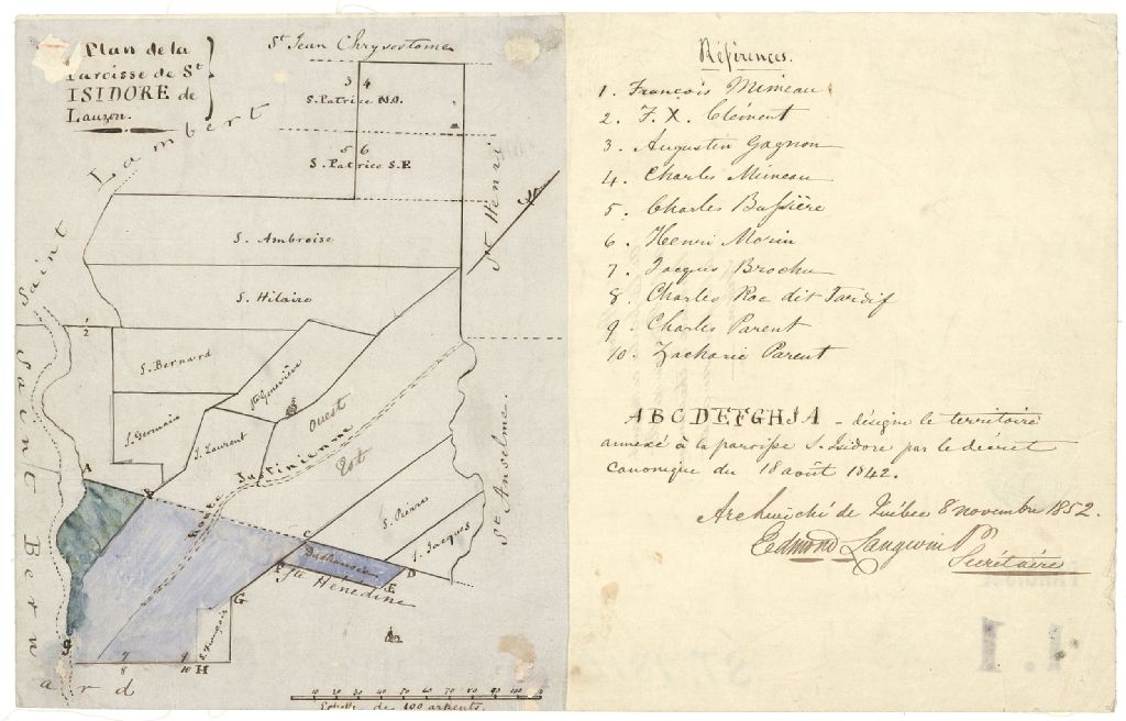 Sur ce plan de la paroisse Saint-Isidore de Lauzon figurent la route Justinienne, une partie de la rivière Chaudière, l'église Sainte-Hénédine, l'église Saint-Isidore, les limites de la paroisse, les églises, le nom des concessions ainsi que les noms suivants : François Mimeau, F.X. Clément, Augustin Gagnon, Charles Mimeau, Charles Bussières, Henri Morin, Jacques Brochu, Charles Roc dit Tardif, Charles Parent et Zacharie Parent. Ce plan désignant le territoire annexé à la paroisse Saint-Isidore par le décret canonique du 18 août 1842
