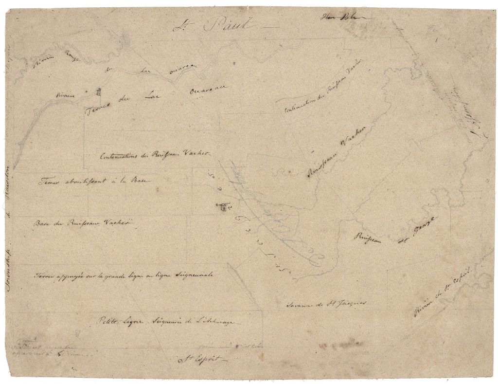 Sur ce plan de la paroisse Saint-Jacques figurent la rivière Saint-Esprit, la rivière Ouareau, la rivière Rouge, le ruisseau Saint-Georges, le ruisseau Vacher, l'église, le moulin, les limites de la paroisse, les rivières et les ruisseaux