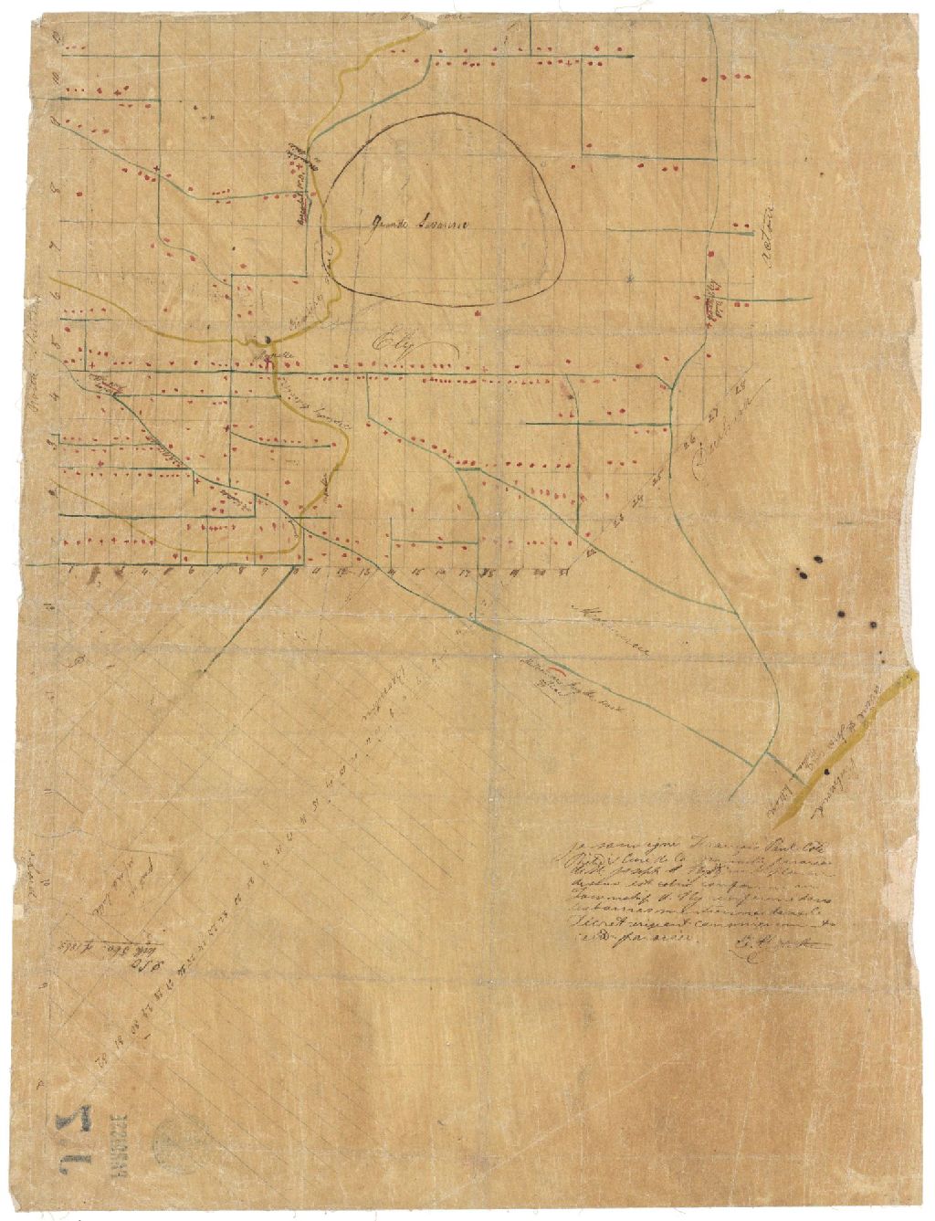 Sur ce plan de la paroisse Saint-Joseph-d'Ely figurent la rivière Noire, le canton Ely, les chemins, les bâtiments, les chapelles, les moulins, les bureaux de poste, le numéro des lots ainsi que les limites de la paroisse