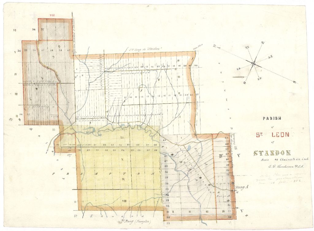 Sur ce plan de la paroisse Saint-Léon-de-Standon dans le canton Standon figurent une partie des cantons Frampton et Buckland, une partie de la rivière Etchemin, le ruisseau à l'Eau Chaude, l'église, les chemins, le numéro des lots, le réseau hydrographique ainsi que les limites de la paroisse