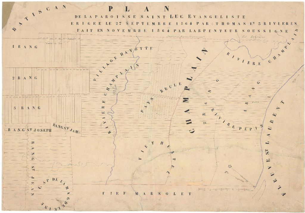 Sur ce plan de la paroisse Saint-Luc située dans la seigneurie Champlain, figurent une partie de la rivière Champlain, l'arrière-fief Hertel, le numéro des lots, les limites de la paroisse, les chemins ainsi que les églises