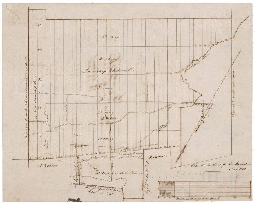 Sur ce plan de la paroisse Saint-Modeste figurent une partie du canton Whitworth, la rivière Verte, les limites de la paroisse, le numéro des lots, les moulins, l'église ainsi que les chemins