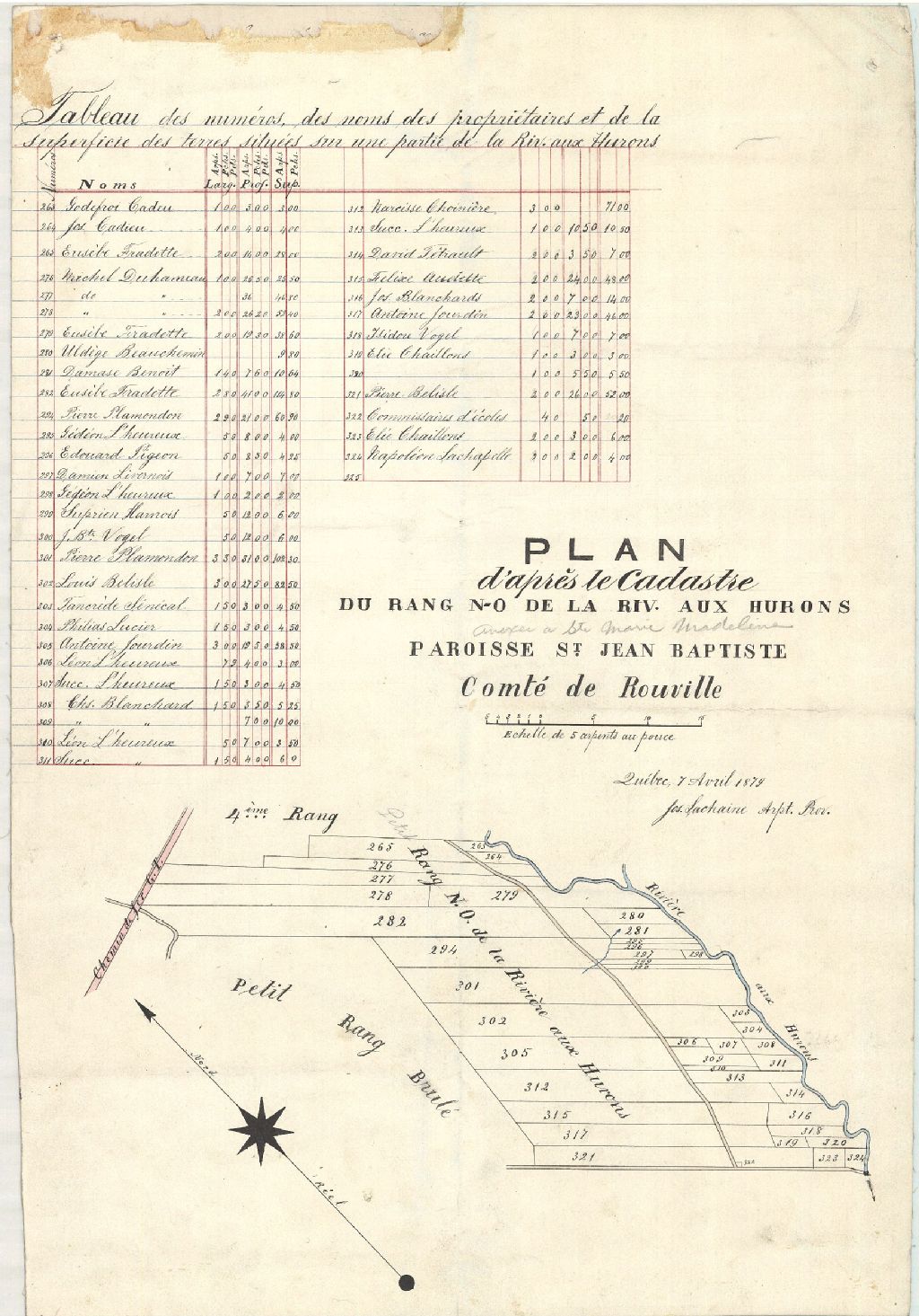 Sur ce plan du rang nord-ouest de la rivière aux Hurons situé dans la paroisse Saint-Jean-Baptiste figurent une partie de la paroisse Sainte-Marie-Madeleine, la rivière des Hurons, la concession Nord-ouest de la rivière aux Hurons, la concession du Petit rang brûlé, les numéros 263 à 325 de la paroisse Saint-Jean-Baptiste, le chemin, le numéro des lots ainsi que le nom d'environ 60 propriétaires. Ce plan comporte un tableau des numéros, des noms de propriétaires et de la superficie des terres