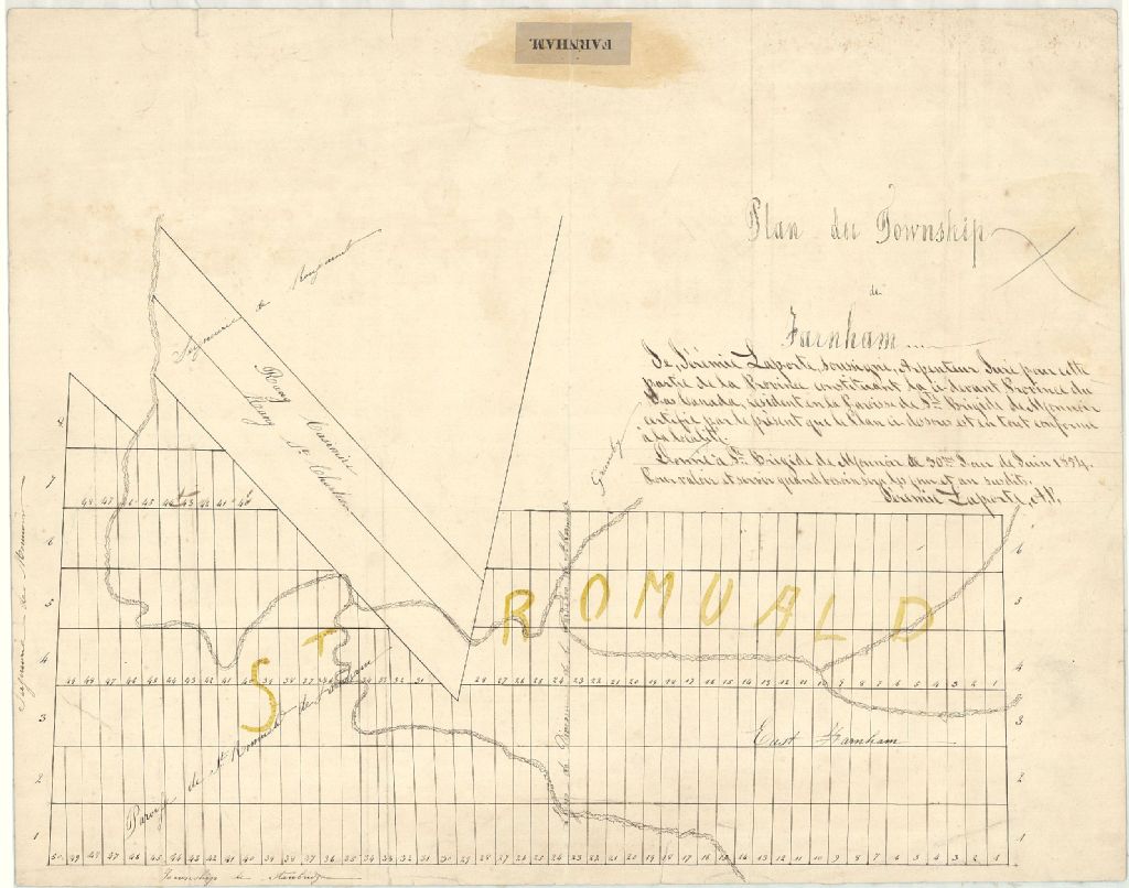 Sur ce plan du canton Farnham figurent la paroisse Saint-Romuald-de-Farnham, le réseau hydrographique, le numéro des lots ainsi que les limites de la paroisse