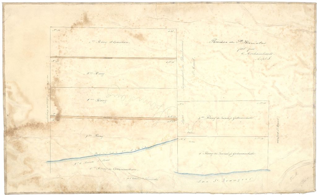 Sur ce plan de la paroisse Saint-Stanislas-de-Kostka située dans la seigneurie Beauharnois figurent une partie de la paroisse Saint-Anicet, une partie du canton Godmanchester, la rivière Saint-Louis, les limites de la paroisse, les chemins et le nom des concessions