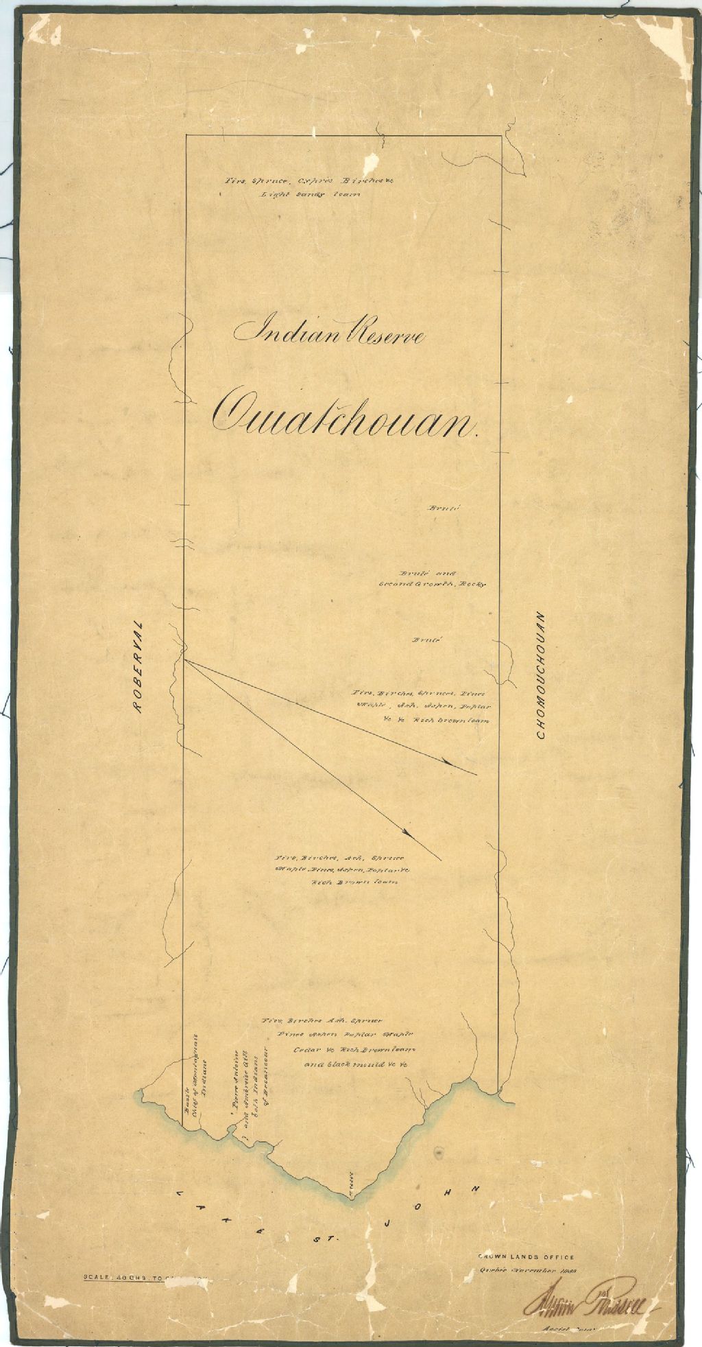 Sur ce plan de la réserve amérindienne Mashteuiatsh ou Ouiatchouan figurent le lac Saint-Jean, Pointe-Bleue, les bâtiments, les essences forestières, les brûlis, les ruisseaux ainsi que les noms Bazile, Pierre Antoine et Ambroise Gill
