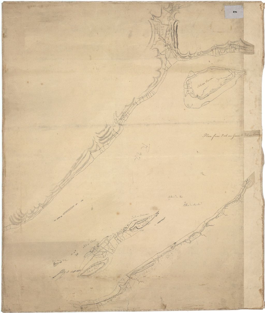 Sur ce plan de l'île aux Grues à l'île aux Coudres figurent l'île aux Oies ou Oiseaux, les routes, les îles, les bâtiments, les églises, les moulins, les piliers et le relief