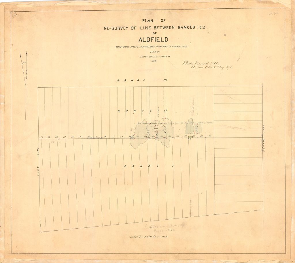 Plan of re-survey of line between ranges 1 & 2 of Aldfield.
