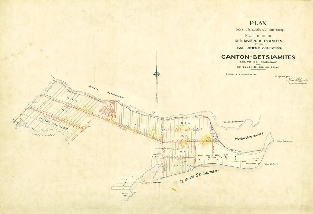 Extrait du plan montrant la subdivision des rangs nos. I-II-III-IV de la rivière Betsiamites et du rang rivière Colombier. Canton de Betsiamites. Comté de Saguenay.