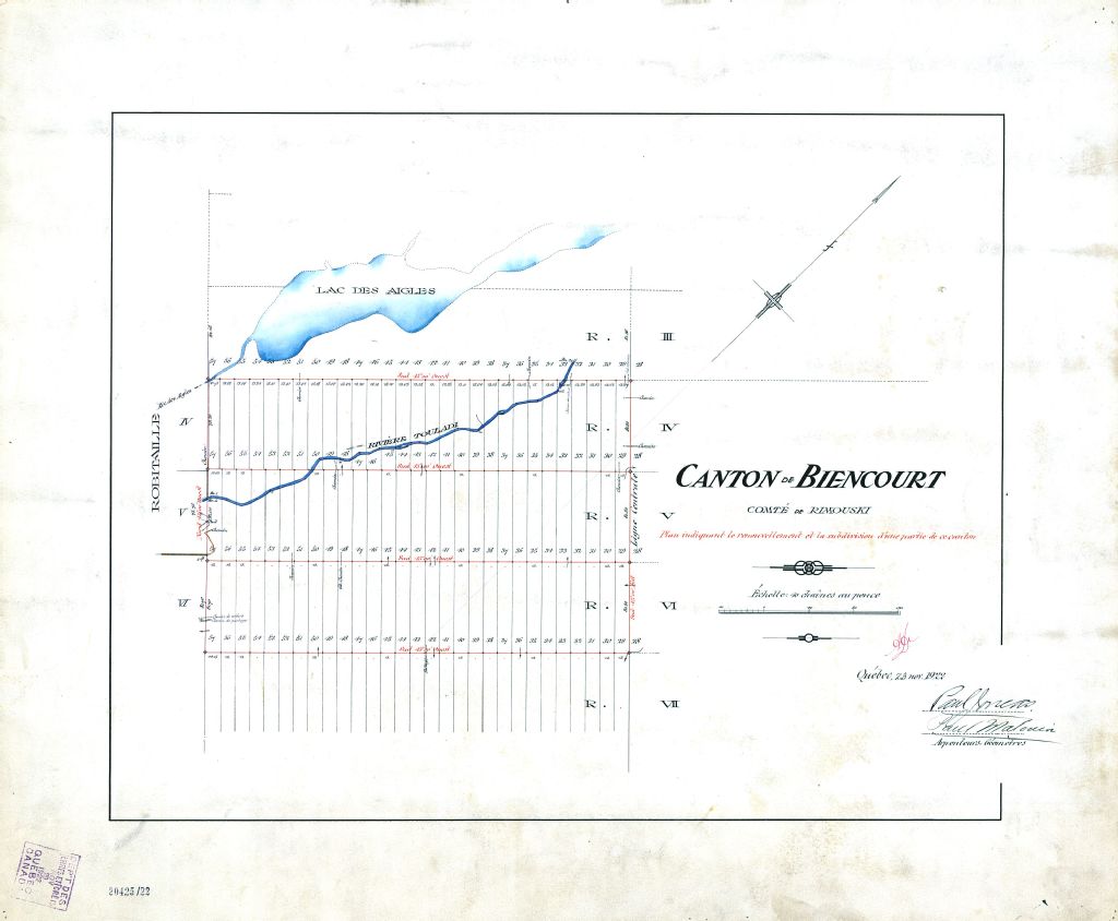 Canton de Biencourt. Comté de Rimouski. Plan indiquant le renouvellement et la subdivision d'une partie de ce canton.