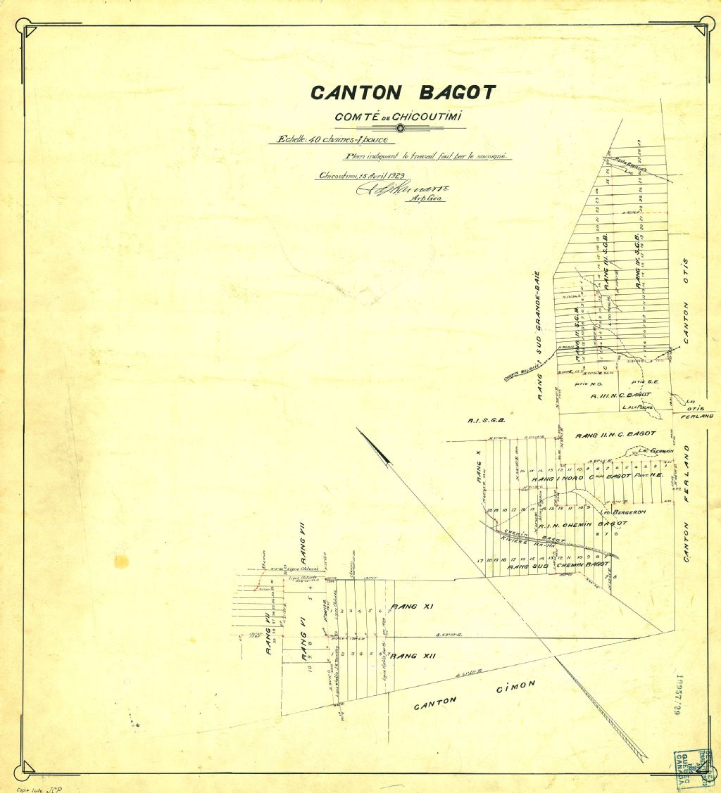Canton Bagot. Comté de Chicoutimi. Plan indiquant le travail fait par le soussigné.