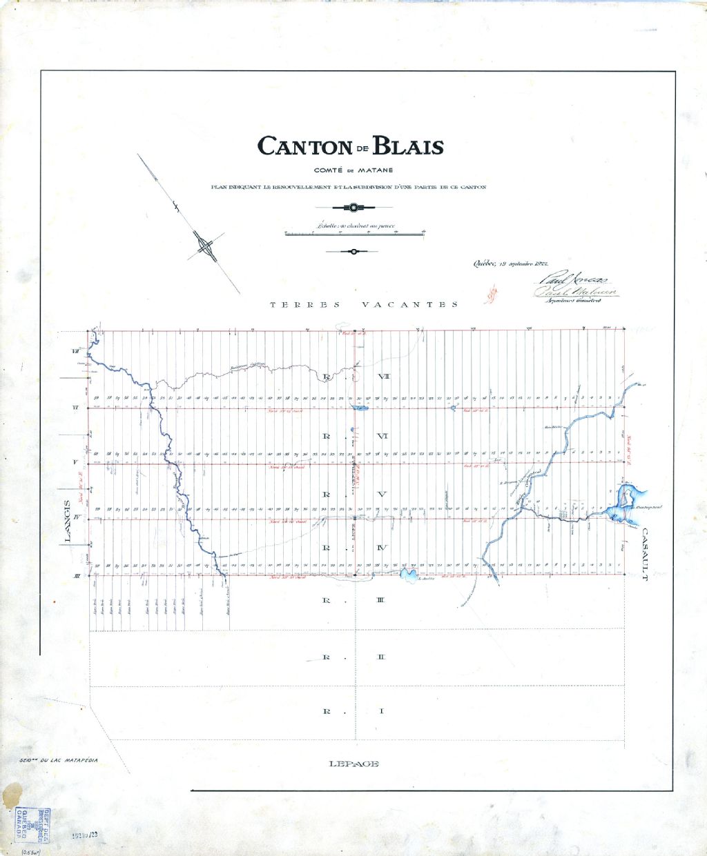 Canton de Blais. Comté de Matane. Plan indiquant le renouvellement et la subdivision d'une partie de ce canton.