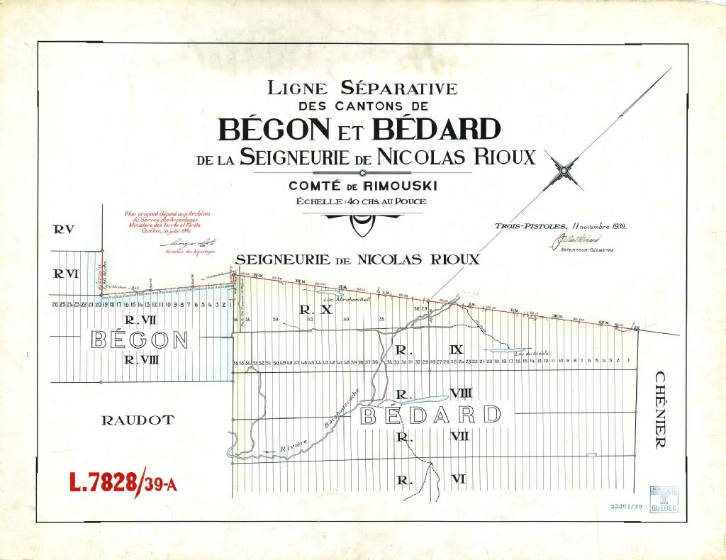 Ligne séparative des cantons de Bégon et Bédard de la seigneurie de Nicolas Rioux. Comté de Rimouski.