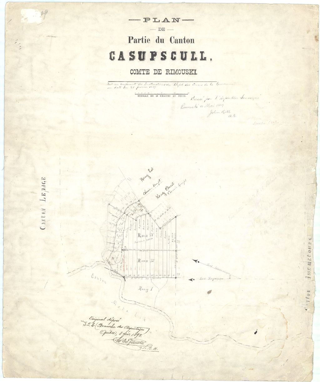 Sur ce plan d'une partie du canton Casupscull figurent les rivières Causapscal et Matapédia, les chemins Matapédia et Kempt, le numéro et la dimension des lots, les bornes et les ruisseaux