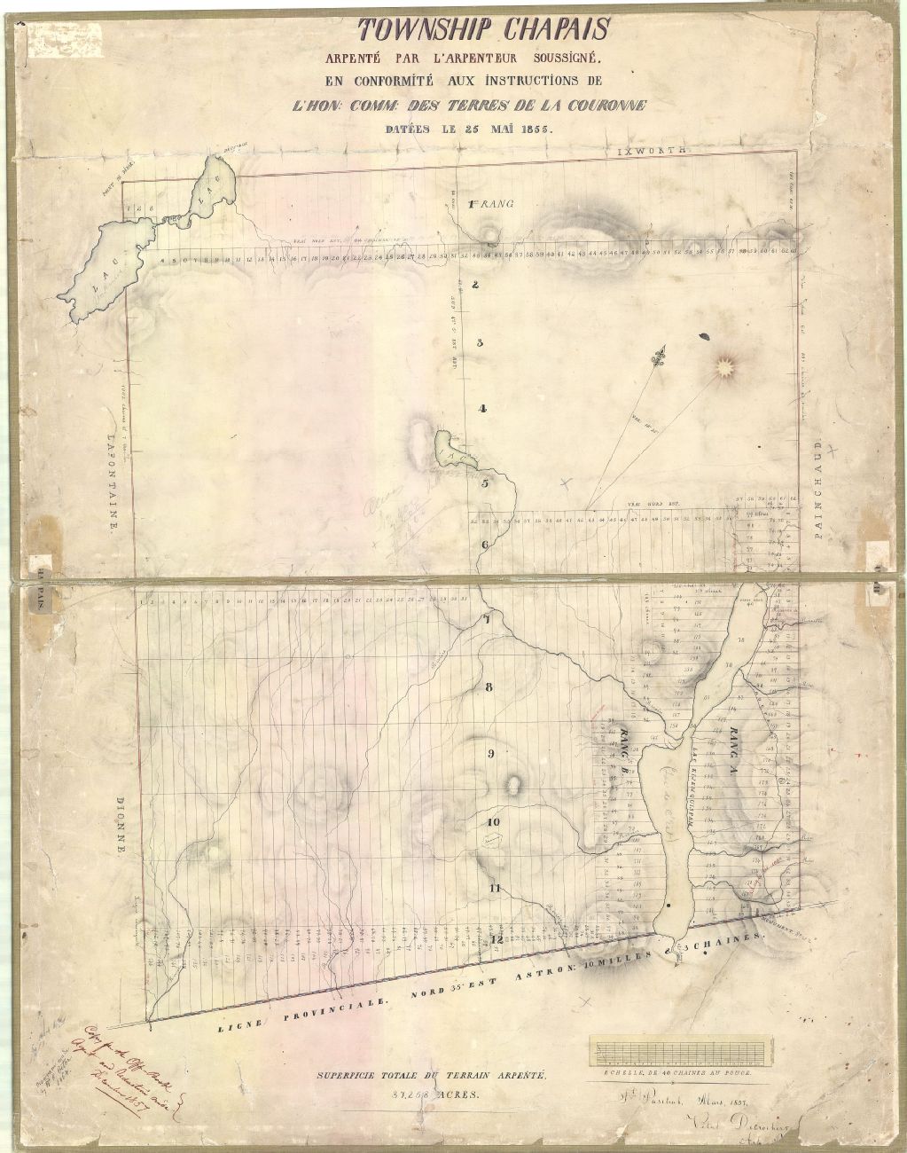 Sur ce plan du canton Chapais figurent les lacs de l'Est, Saint-Anne et de la Grosse Truite, le numéro et la dimension des lots, la décharge, le réseau hydrographique, le relief et la savane