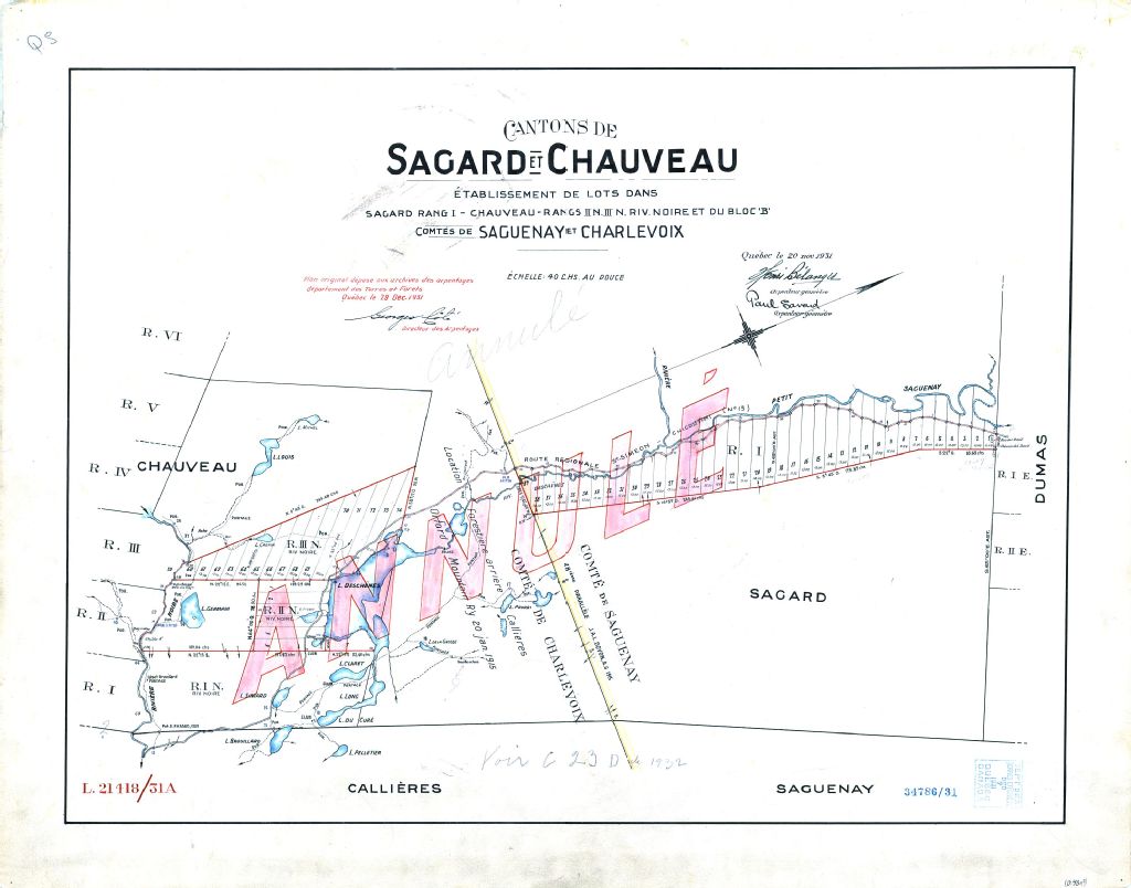 Cantons de Sagard et Chauveau. Établissement de lots dans Sagard rang I - Chauveau - rangs II N. III N. Riv. Noire et du bloc 'B'. Comtés de Saguenay et Charlevoix.