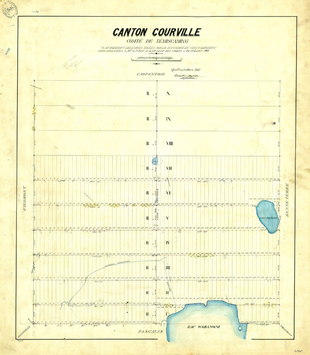 Canton Courville. Comté de Témiscaming. Plan indiquant les lignes tirées par le soussigné en vertu d'instructions adressées à Mr. G.P. Roy. A.G., en date des 7 mars & 20 juillet 1911.