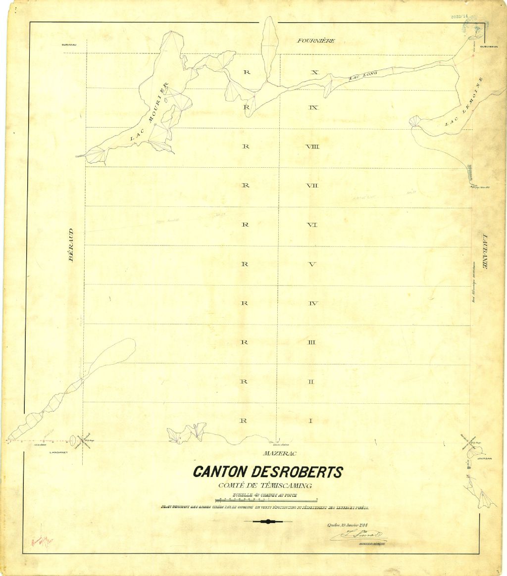 Canton Desroberts. Comté de Témiscaming. Plan indiquant les lignes tirées par le soussigné en vertu d'instructions du département des Terres et Forêts.