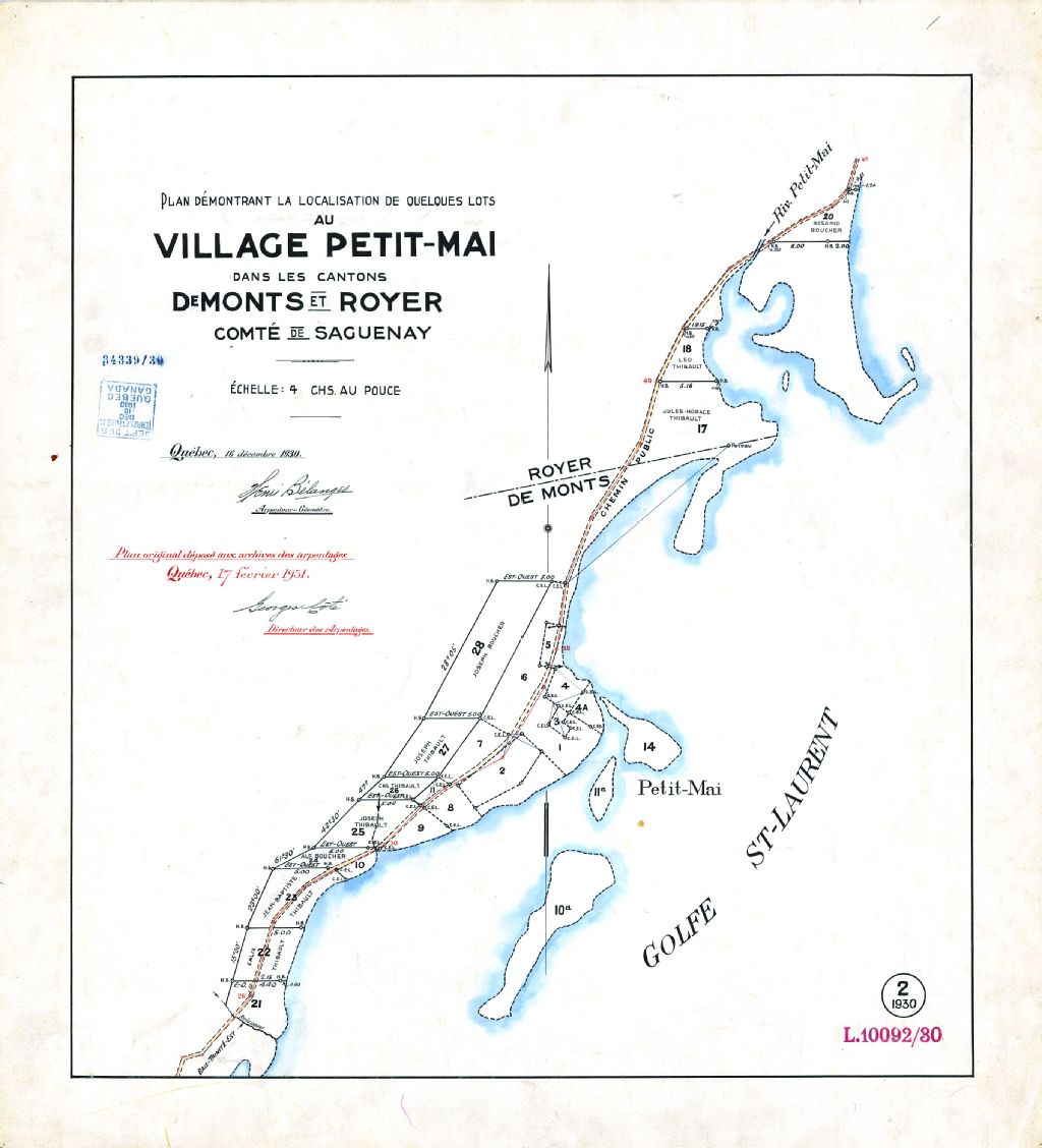 Plan démontrant la localisation de quelques lots au village Petit-Mai dans les cantons DeMonts et Royer. Comté de Saguenay.
