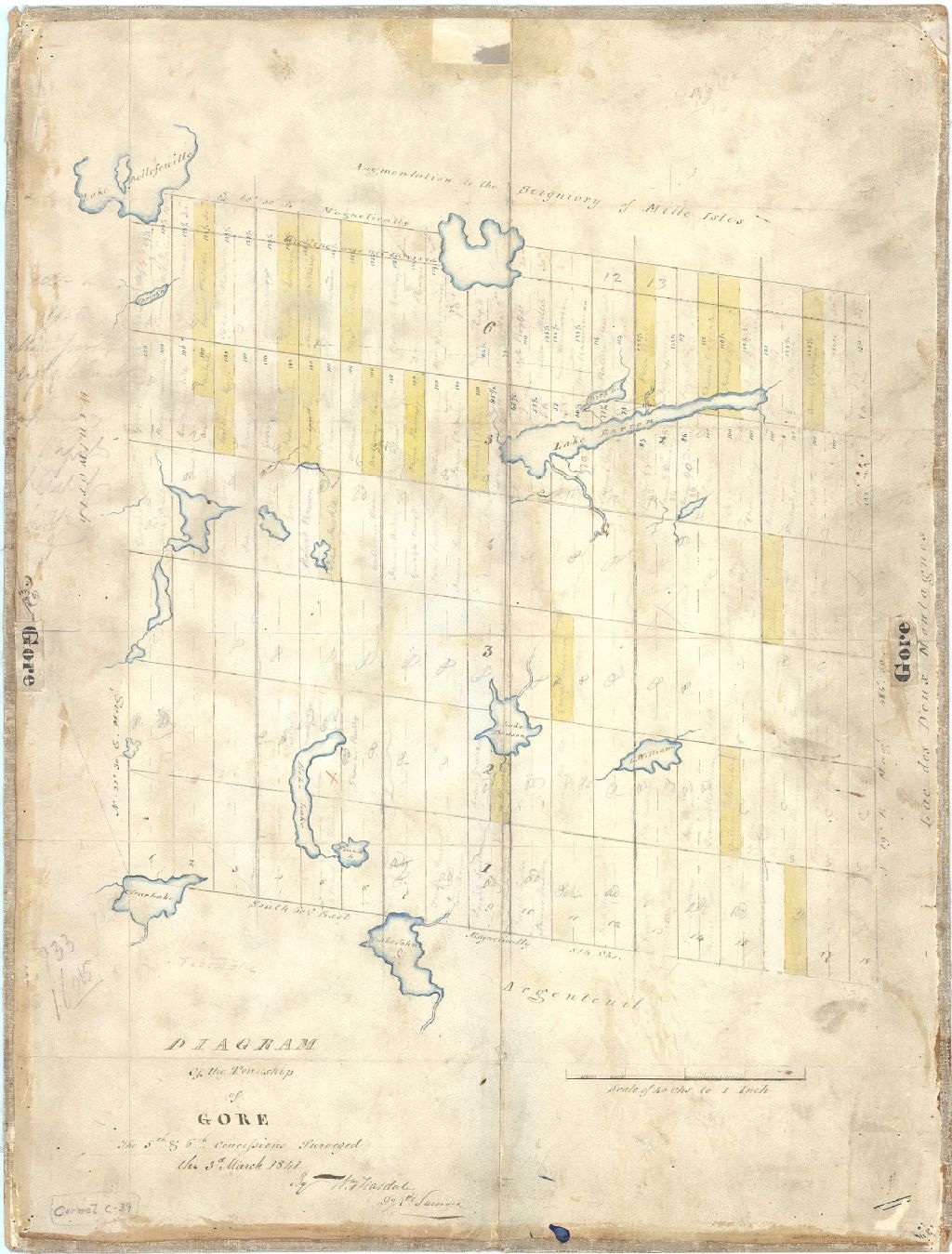 Sur ce plan d'une partie du canton Gore figurent les lacs Barron, aux Oiseaux, Dawson, Écho, Bond et Clair. On y retrouve également la dimension des lots, les ruisseaux et les noms des propriétaires