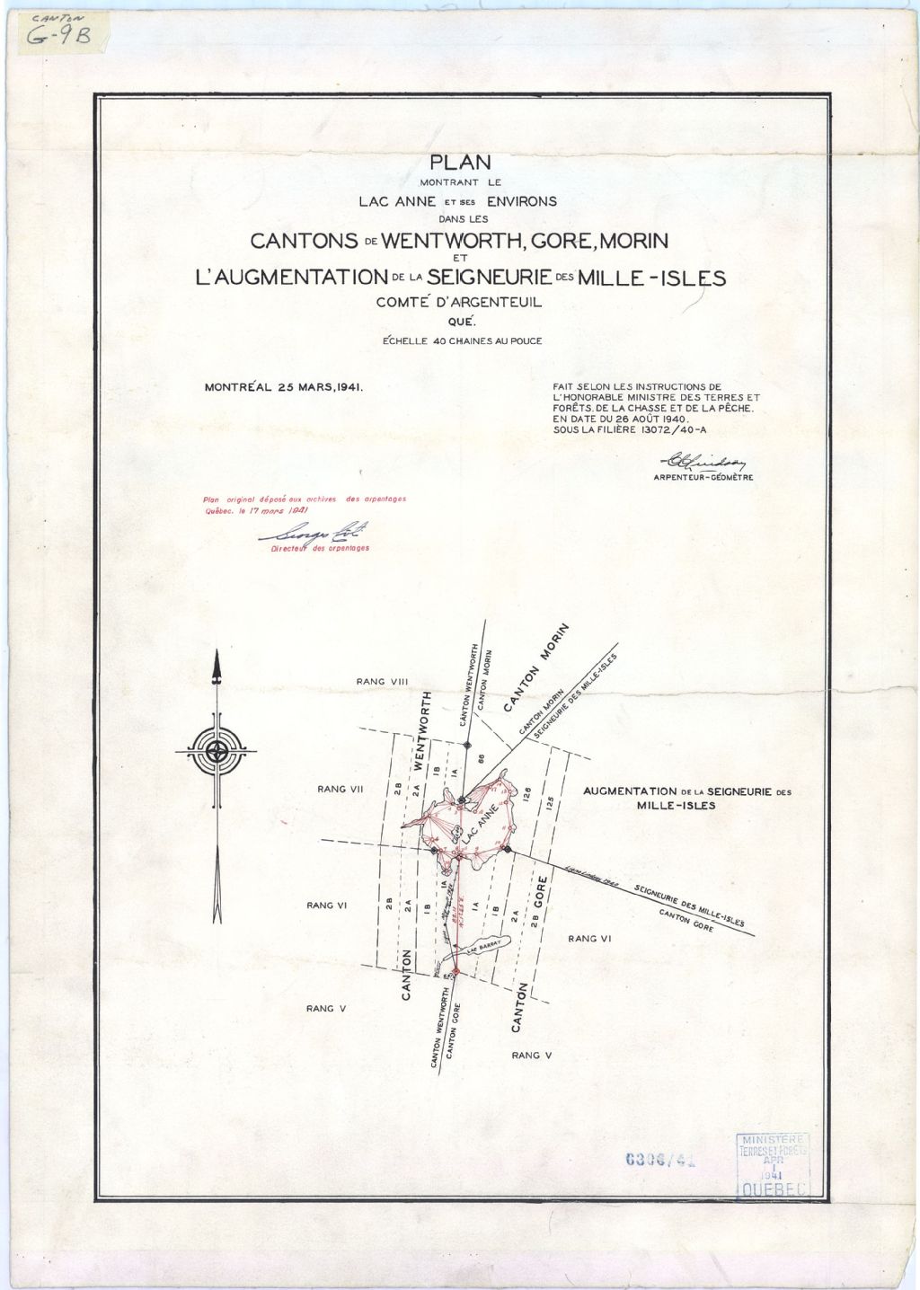 Plan montrant le lac Anne et ses environs dans les cantons de Wentworth, Gore, Morin, et l'augmentation de la seigneurie des Milles-Isles