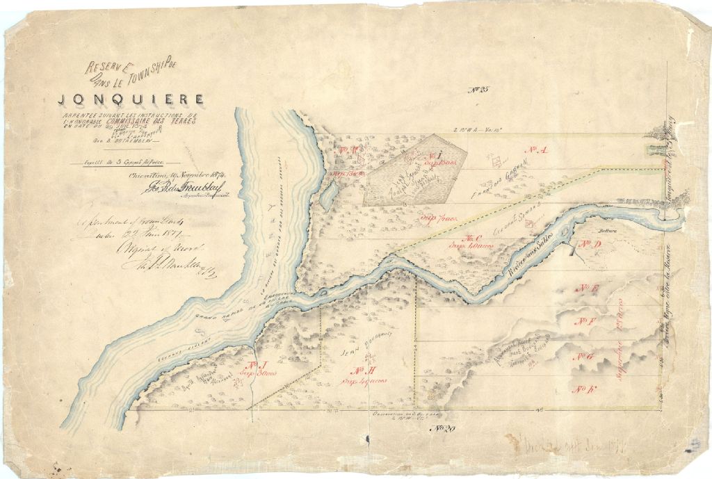 Sur ce plan d'une partie du canton Jonquière figurent l'embouchure de la rivière aux Sables, une partie de la rivière Saguenay, le numéro des lots, la dimension des lots et les bornes. On y retrouve également les battures, la végétation, le relief, les rapides et les noms David Brassard, Alexandre Brassard, Jean Boudrault, Louis Pednault, Jean Larouche, François Gagnon, Théophile Bouchard et Alexandre Houle
