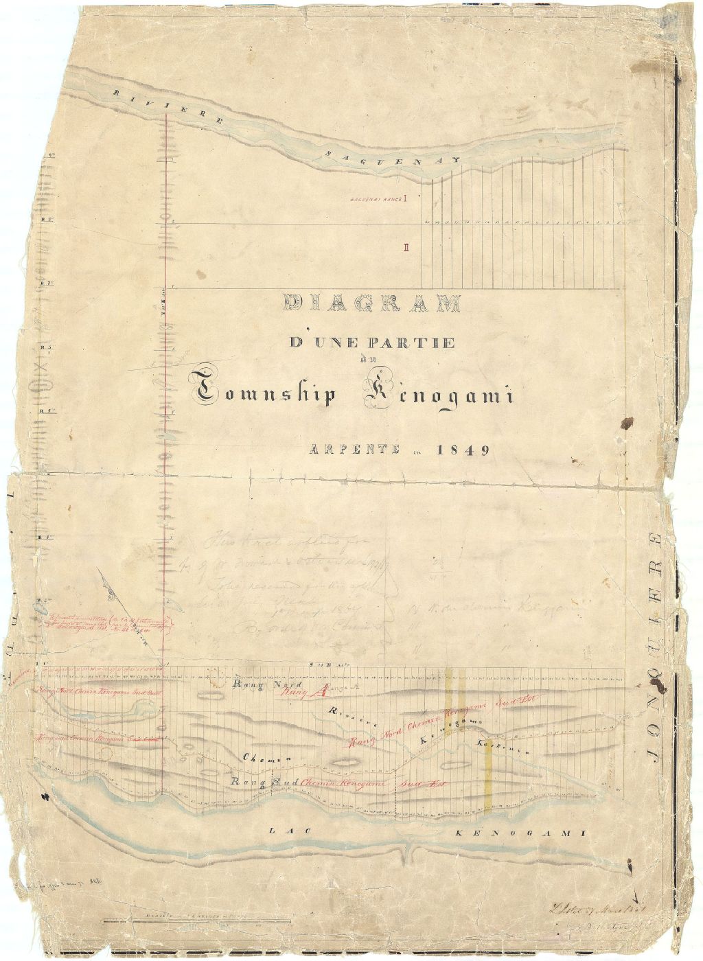 Sur ce plan d'une partie du canton Kénogami figurent le lac Kénogami, le chemin Kénogami, le numéro des lots, la dimension des lots, le chemin, les bornes, le réseau hydrographique et le relief