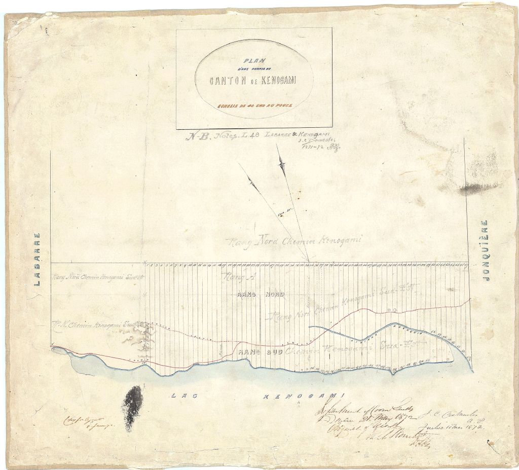 Sur ce plan d'une partie du canton Kénogami figurent le lac Kénogami, la rivière Cascouia, les chemins, l'ancien chemin, le numéro des lots, l'église et les bâtiments
