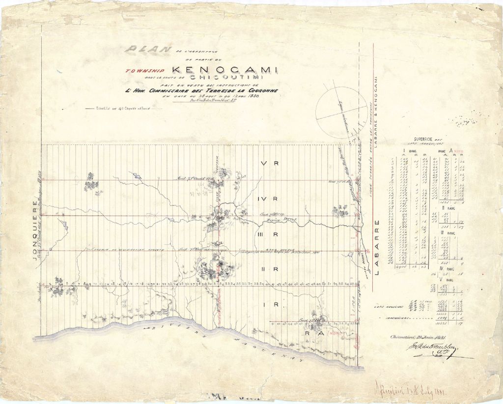 Plan de l'arpentage d'une partie du township Kénogami dans le comté de Chicoutimi.