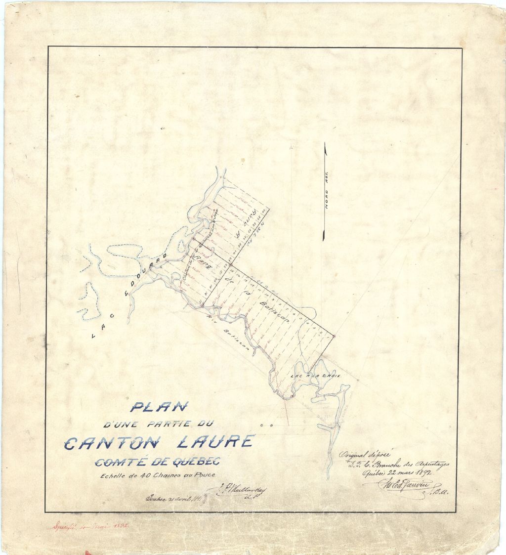 Sur ce plan d'une partie du canton Laure figurent la rivière Batiscan entre autres, le lac Édouard, le lac à la Croix, le numéro des lots, la dimension des lots, le chemin de fer et le chemin de fer Québec et Lac St-Jean