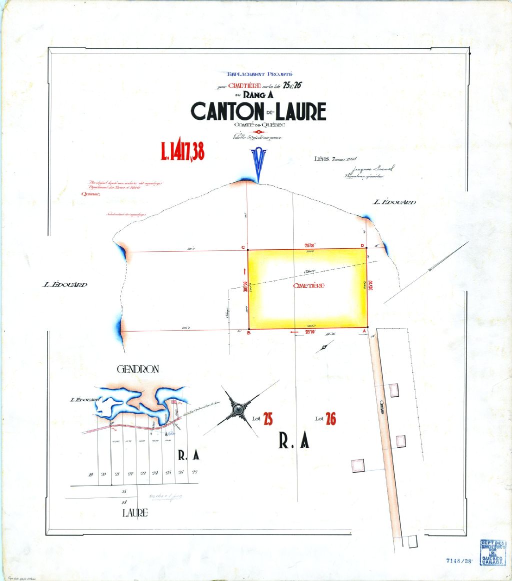 Emplacement projeté pour cimetière sur les lots 25 & 26 du rang A. Canton de Laure. Comté de Québec.