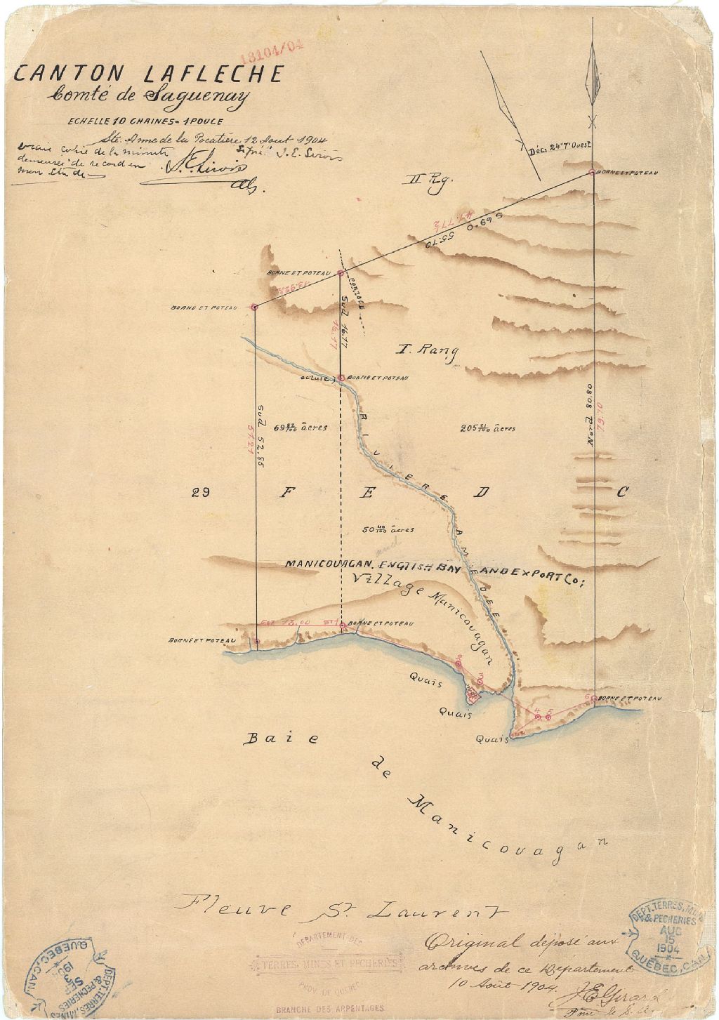 Sur ce plan d'une partie du canton Laflèche figurent la baie de Manicouagan, une partie du fleuve Saint-Laurent, le village de Manicouagan, la rivière Amédée, les bornes, l'écluse, la dimension des lots, les quais, le portage et le relief
