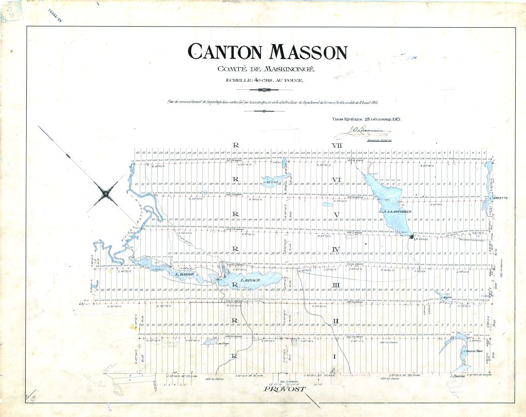 Canton Masson. Comté de Maskinongé. Plan du renouvellement de l'arpentage de ce canton, fait par le soussigné, en vertu d'instructions du Département de Terres & Forêts, en date du 24 août 1915.