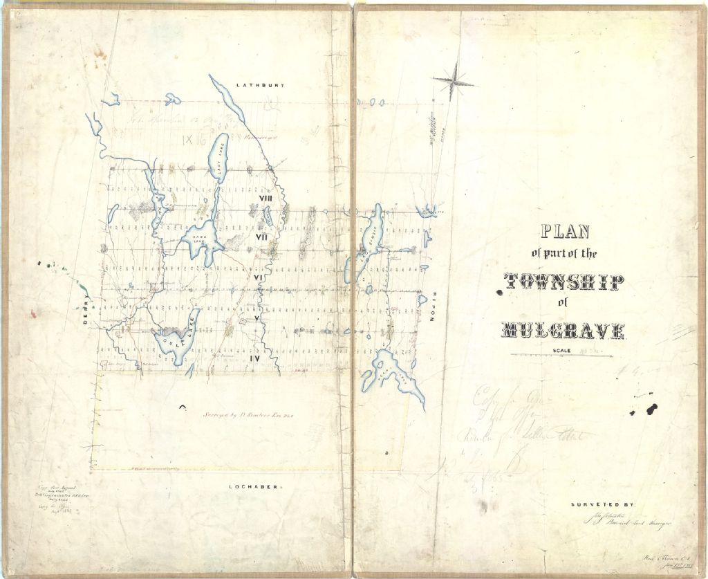 Sur ce plan d'une partie du canton Mulgrave figurent les lacs Gull, Lon, du Faucon, de la Dame, à la Truite, en Coeur et le Petit lac Saint-Sixte ou Sinsic ainsi que le chemin Cameron. On y retrouve également la division des lots, la dimension des lots, les barrages, les rapides, les prairies, le moulin et les bâtiments. Figurent également sur le plan les portages dont le portage amérindien, le réseau hydrographique, le relief et les noms des propriétaires