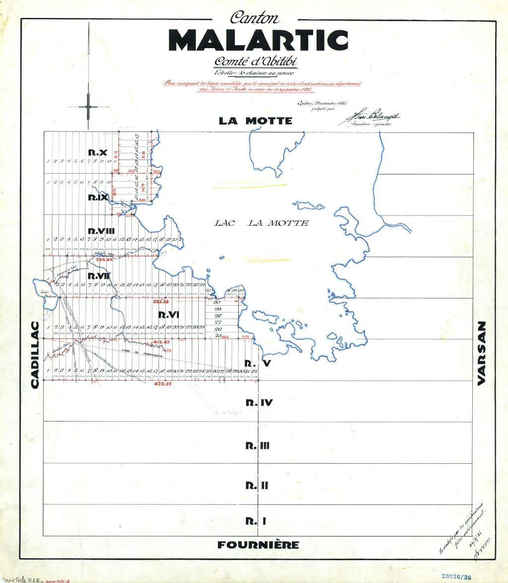 Canton Malartic. Comté d'Abitibi. Plan indiquant les lignes renouvelées par le soussigné en vertu d'instructions du département des Terres et Forêts en date du 11 septembre 1935.