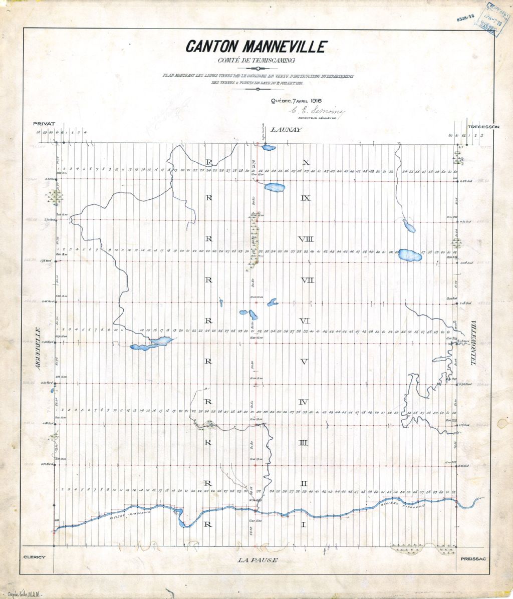 Canton Manneville. Comté de Témiscaming. Plan montrant les lignes tirées par le soussigné en vertu d'instructions du département des Terres & Forêts en date du 2 juillet 1915.