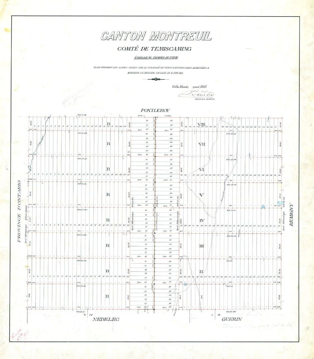 Canton Montreuil. Comté de Témiscaming. Plan indiquant les lignes tirées par le soussigné en vertu d'instructions adressées à Monsieur P.E. Mercier, en date du 13 juin 1913.