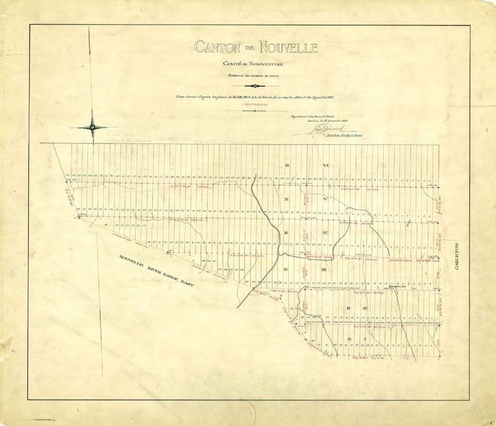Canton de Nouvelle. Comté de Bonaventure. Plan dressé d'après les plans de M.D.W. Mill A.G., datés du 15 novembre 1910 et du 31 juillet 1919.