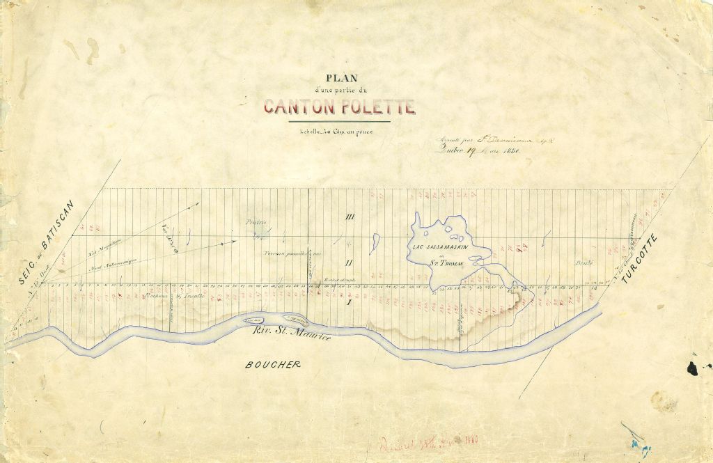 Front des rangs I à III partie de la ligne centrale, ligne extérieure Sud-Ouest (Seigneurie Batiscan) et levée, cantons Polette et Suffolk
