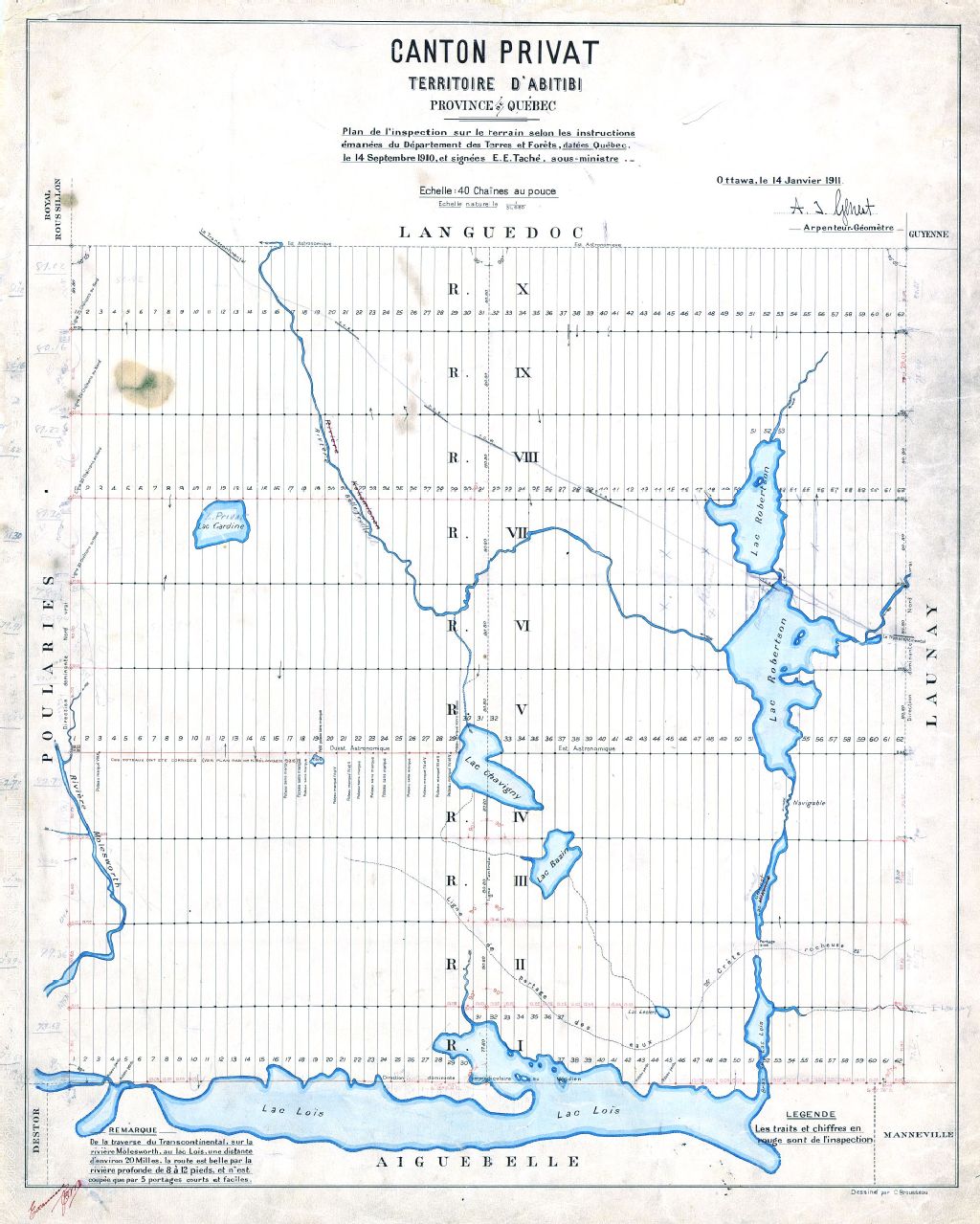 Canton Privat. Territoire d'Abitibi. Province de Québec. Plan de l'inspection sur le terrain selon les instructions émanées du Département des Terres et Forêts, datées Québec, le 14 septembre 1910, et signées E.E. Taché sous-ministre.