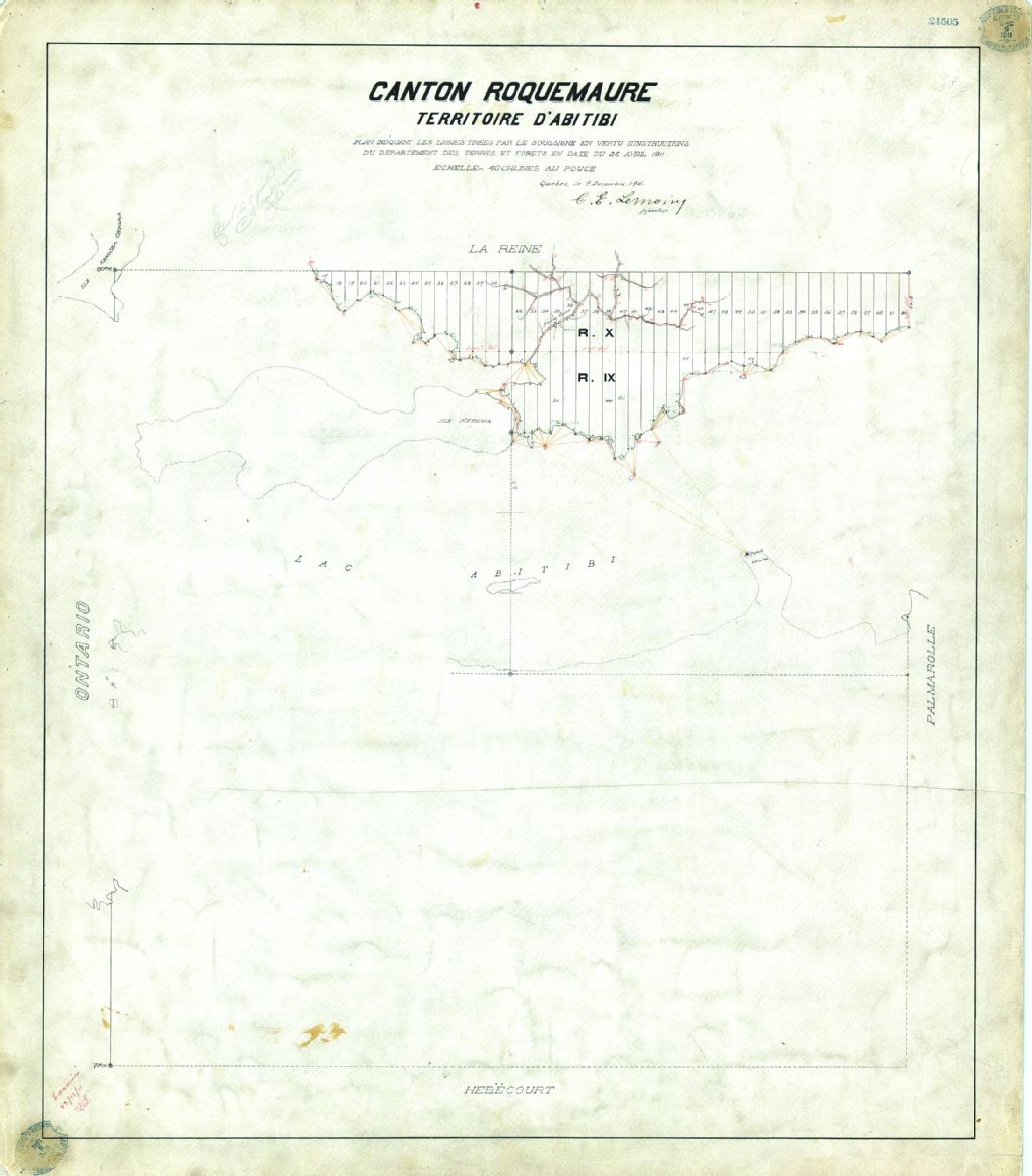 Canton Roquemaure. Territoire d'Abitibi. Plan indiquant les lignes tirées par le soussigné en vertu d'instructions du département des Terres et Forêts en date du 26 avril 1911.