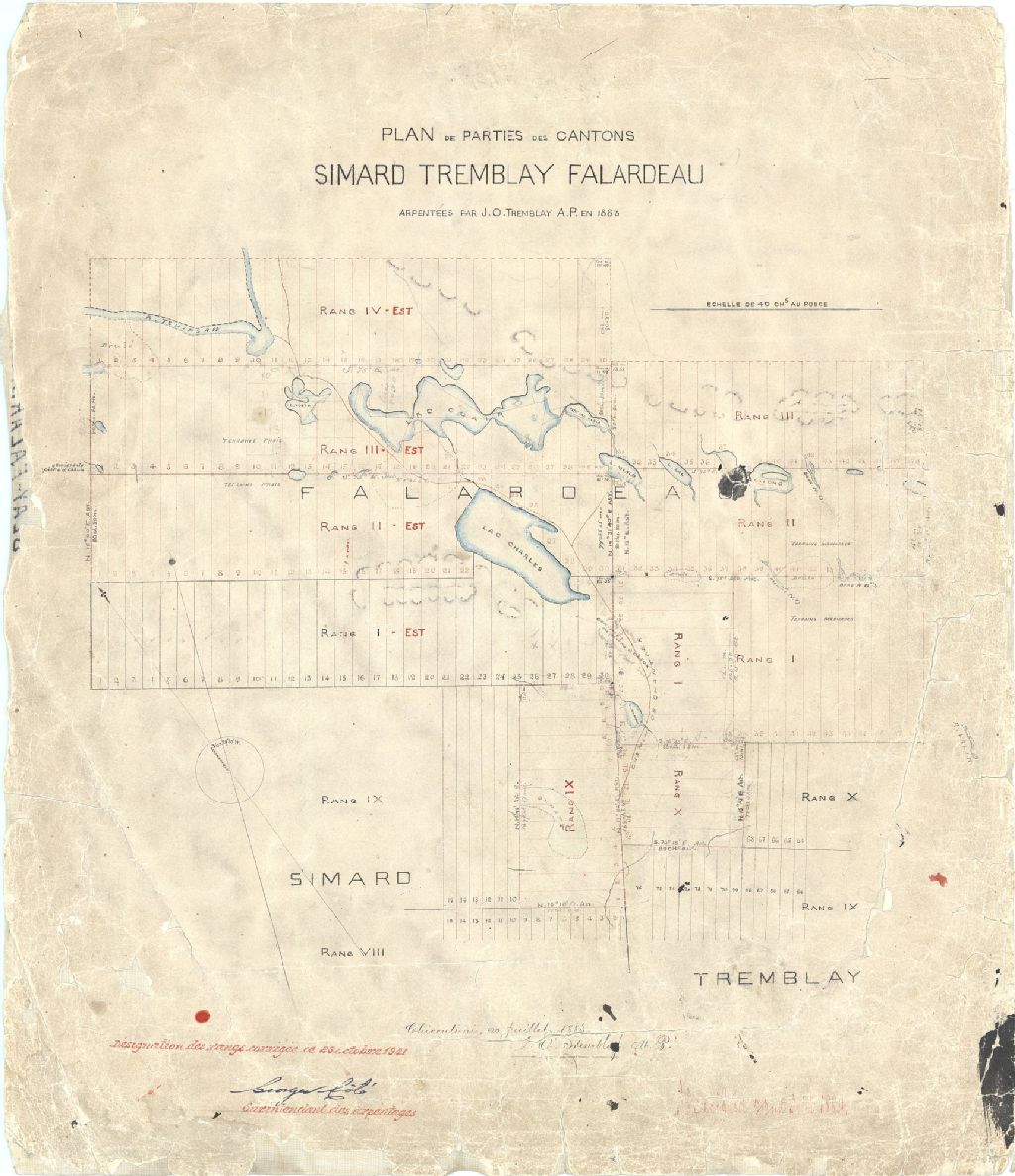 Sur ce plan de parties des cantons Simard, Tremblay et Falardeau figurent le lac Grenon ou Charles, le numéro des lots, la savane, le chemin de chantier, la carrière de pierres à chaux, la qualité du sol, les brûlis, les bornes, le relief et le réseau hydrographique