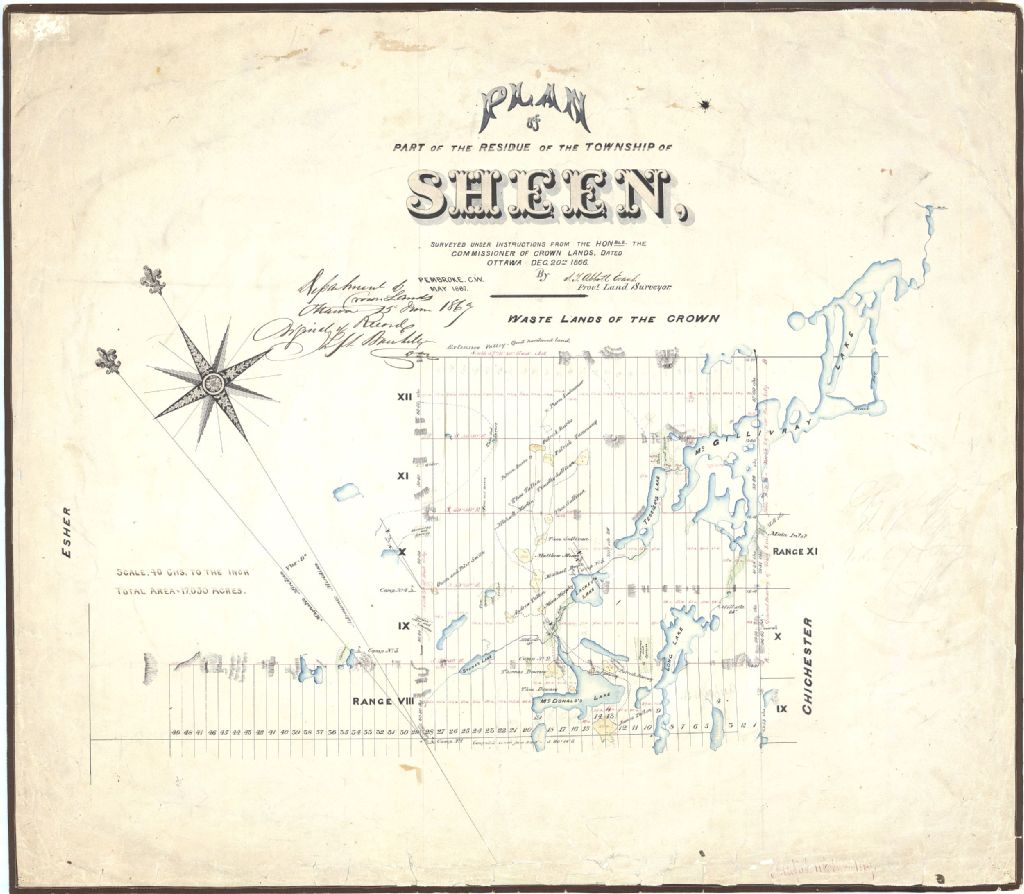 Sur ce plan d'une partie du canton Sheen figurent les lacs McGillivray, Tessier, Lackey, Long, McDonald et Stone. On y retrouve également le numéro et la dimension des lots, la qualité du sol, les essences forestières, les moulins, les camps, les marécages, le relief, le réseau hydrographique ainsi que le nom d'environ 15 propriétaires