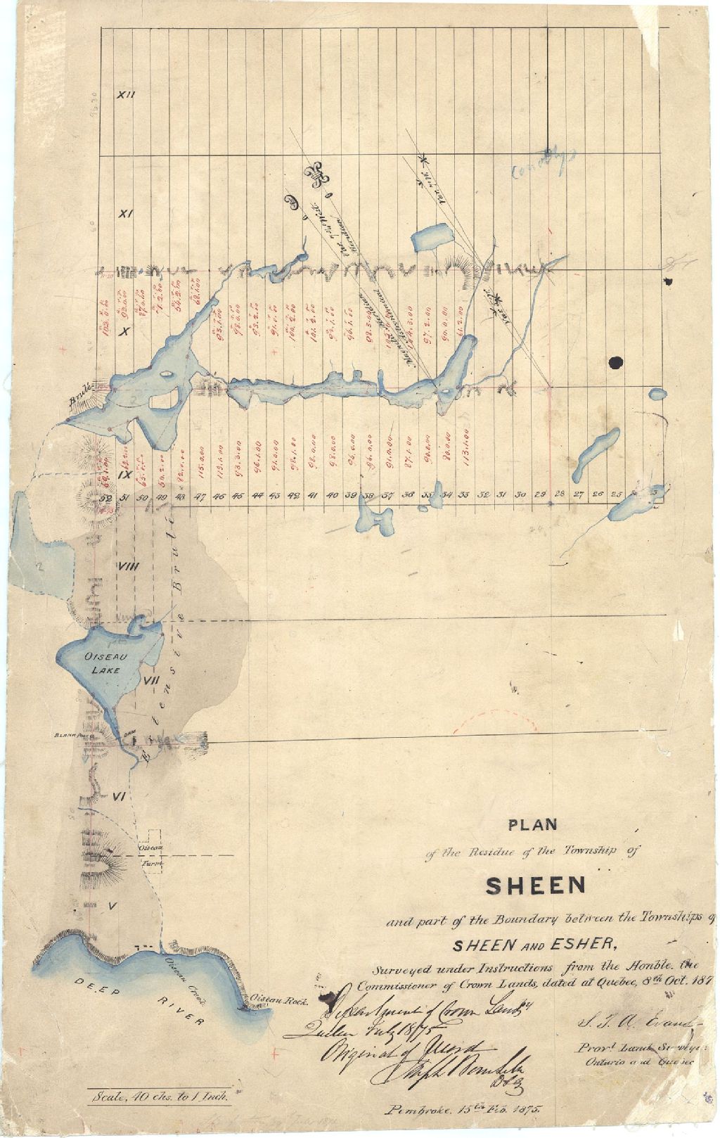 Sur ce plan relatif au canton Sheen figurent une partie du canton Esher, la rivière Deep, le lac à l'Oiseau, le numéro et la dimension des lots, les brûlis, les bornes, le réseau hydrographique, le barrage, le relief, les bâtiments et la ferme