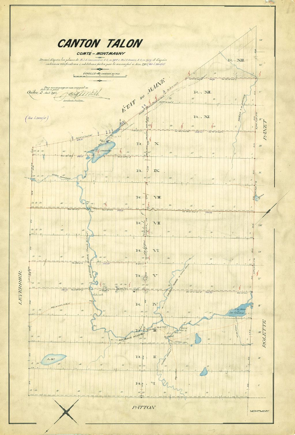 Canton Talon. Comté de Montmagny. Dressé d'après les plans de M. J.A. Lacoursière, A.G., en 1906 & M. J.E. Girard. A.G., en 1909 et d'après certaines vérifications & additions faites par le soussigné en juin 1915.