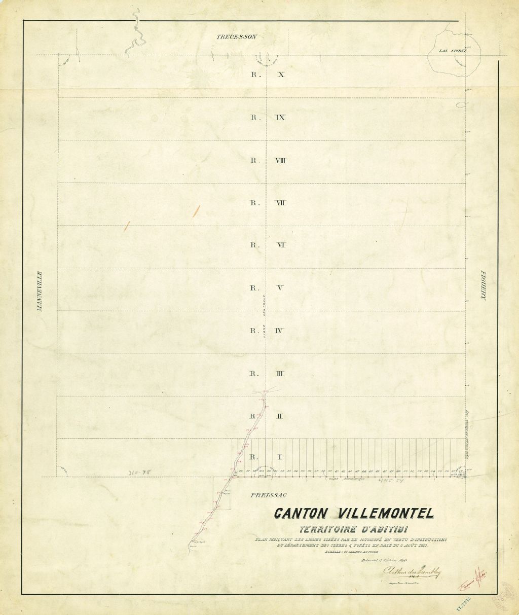 Canton Villemontel. Territoire d'Abitibi. Plan indiquant les lignes tirées par le soussigné en vertu d'instructions du département des Terres & Forêts en date du 5 août 1910.