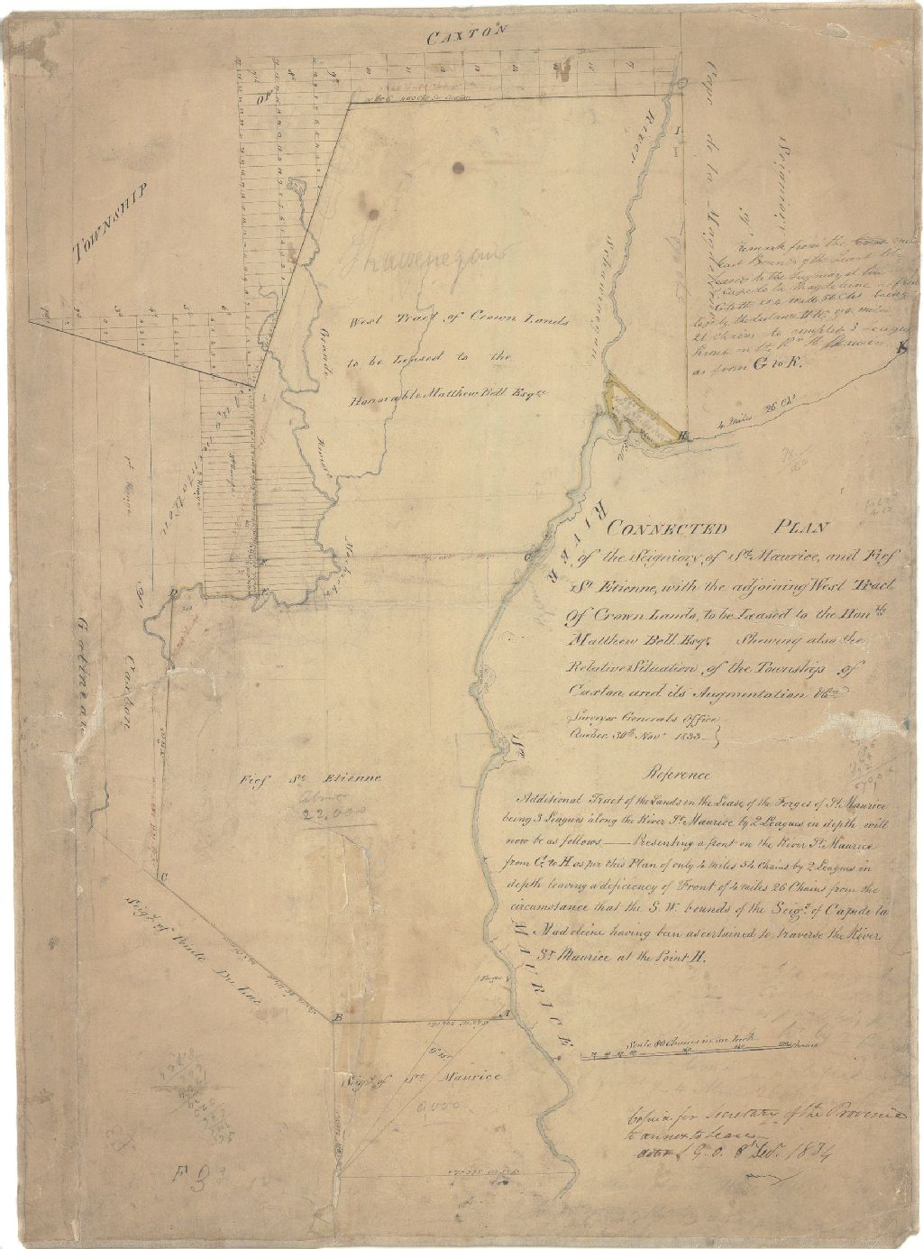 Connected plan of the seigniory of St. Maurice, St. Maurice River and fief St. Etienn with the adjoining West tract of Crown Lands, to be leased [...] to Matthew Bell Esq, shewing also the relative situation of the township of Caxton and its augmentation